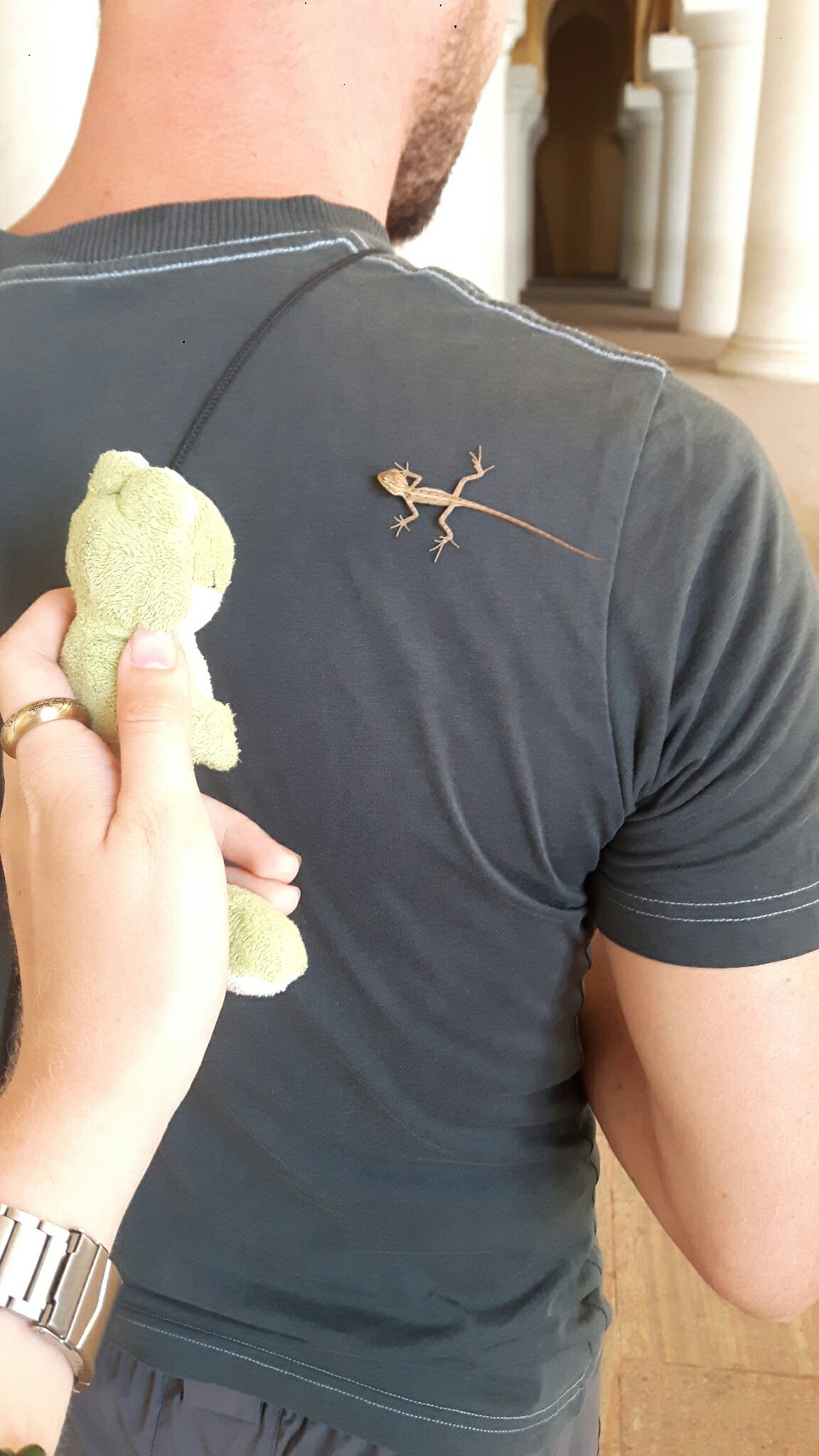 He actually had it on his hand, but then it started crawling up and he just let it. Then it sat on his shoulder.